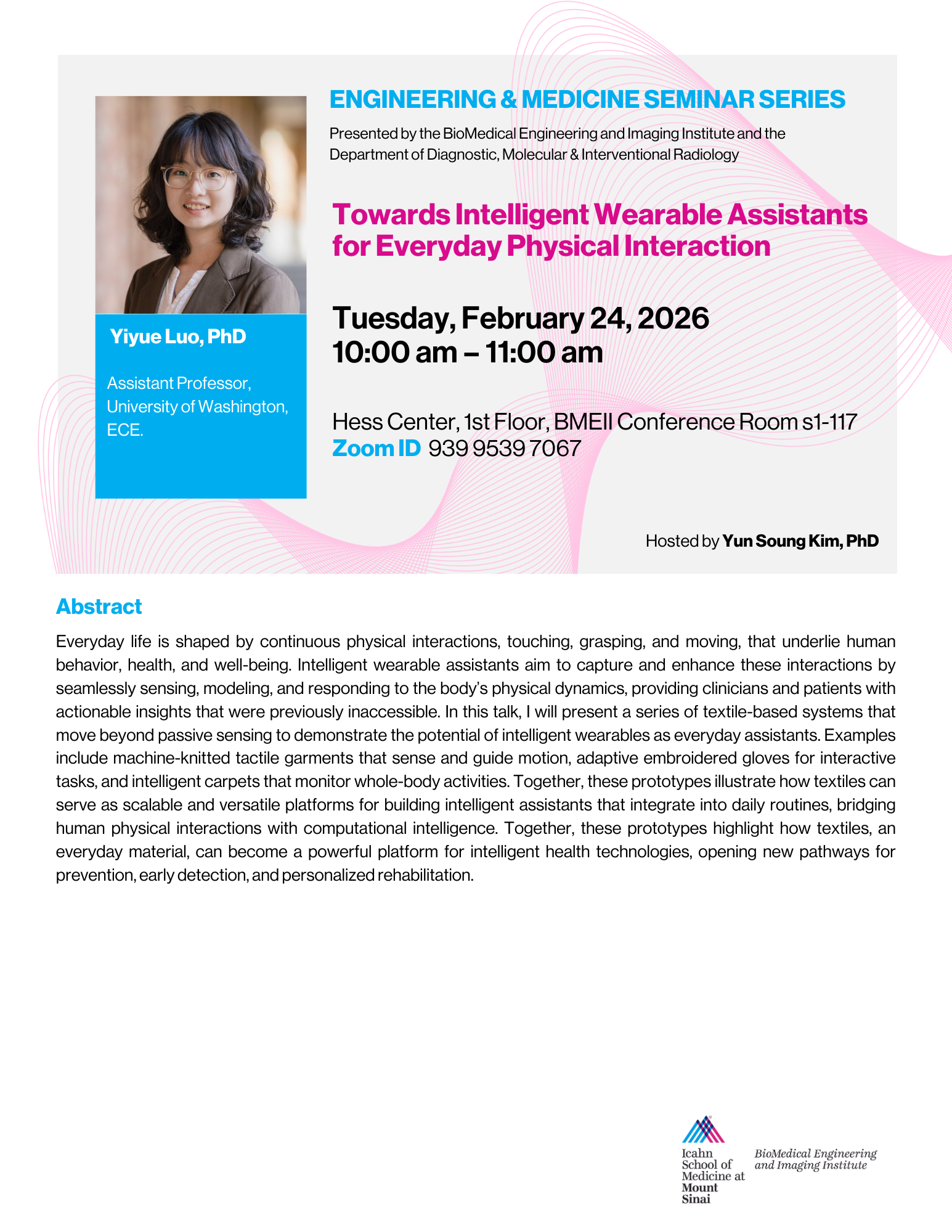 Everyday life is shaped by continuous physical interactions, touching, grasping, and moving, that underlie human behavior, health, and well-being. Intelligent wearable assistants aim to capture and enhance these interactions by seamlessly sensing, modeling, and responding to the body’s physical dynamics, providing clinicians and patients with actionable insights that were previously inaccessible. In this talk, I will present a series of textile-based systems that move beyond passive sensing to demonstrate the potential of intelligent wearables as everyday assistants. Examples include machine-knitted tactile garments that sense and guide motion, adaptive embroidered gloves for interactive tasks, and intelligent carpets that monitor whole-body activities. Together, these prototypes illustrate how textiles can serve as scalable and versatile platforms for building intelligent assistants that integrate into daily routines, bridging human physical interactions with computational intelligence. Together, these prototypes highlight how textiles, an everyday material, can become a powerful platform for intelligent health technologies, opening new pathways for prevention, early detection, and personalized rehabilitation.
