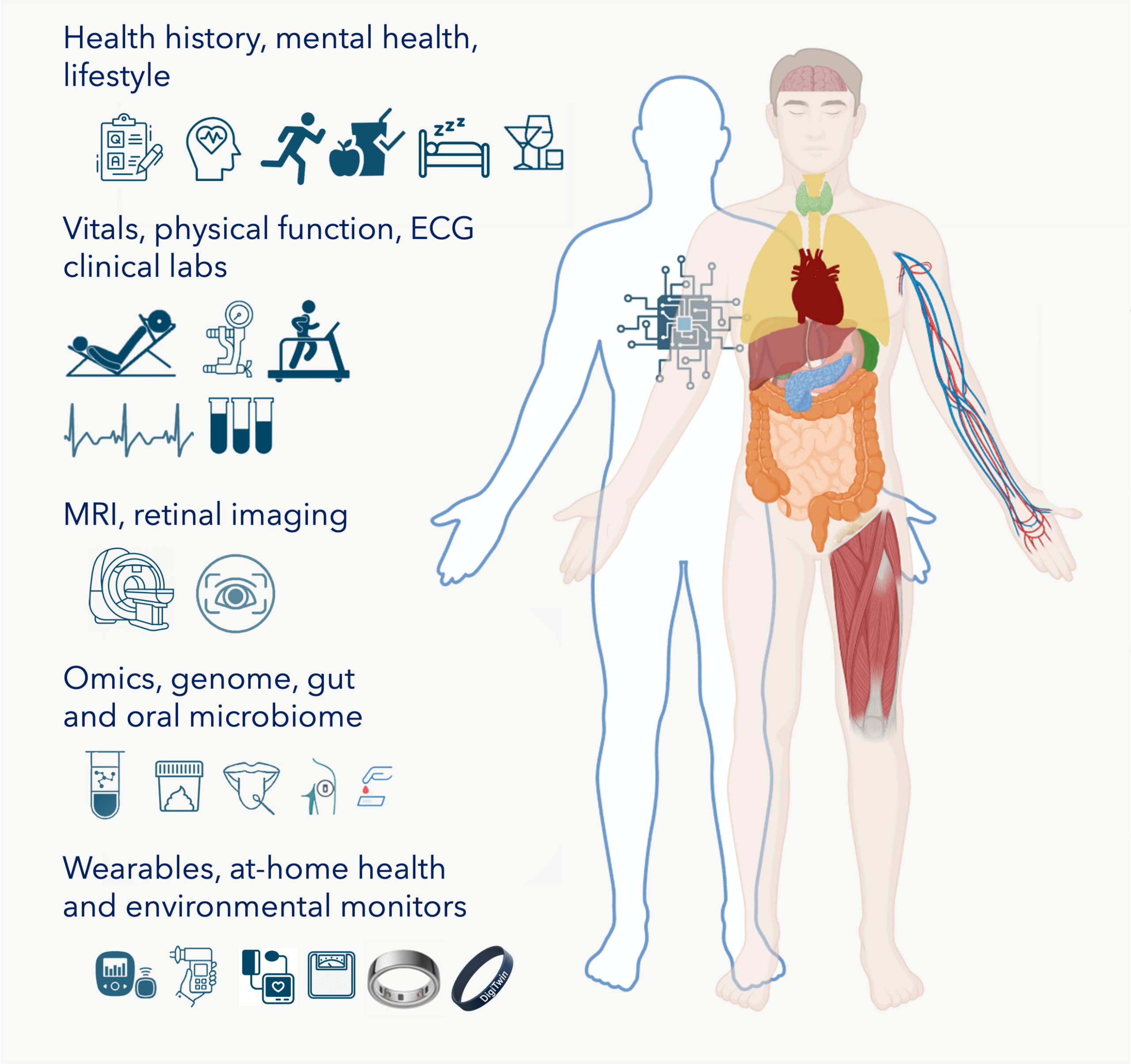 | Vitals and physical function tests | Standard measures of vital signs (height, weight, blood pressure, pulse, and respiration), exercise capacity and lung function, leg and grip strength, and electrocardiography (ECG), will be collected during a study visit to our facility. | These tests will provide established markers of health – an essential starting point for building next generation models. |